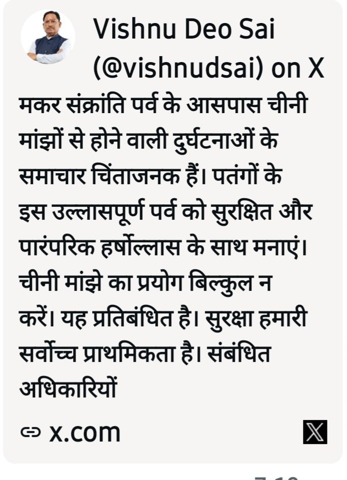रायपुर 12 जनवरी 2026/मुख्यमंत्री श्री विष्णु देव साय ने मकर संक्रांति पर्व के अवसर पर प्रदेशवासियों से पतंगों के इस उल्लासपूर्ण पर्व को सुरक्षित, जिम्मेदार और पारंपरिक हर्षोल्लास के साथ मनाने की अपील की है। उन्होंने कहा है कि त्योहार के आसपास चीनी मांझा से होने वाली दुर्घटनाओं की खबरें अत्यंत चिंताजनक हैं, इसलिए इसका प्रयोग पूरी तरह से वर्जित है।